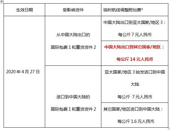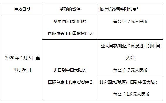* 针对所有国际包裹和重货货件,该临时航线调整附加费有最低收费。国际包裹 1货件:每票货最低收费人民币 7 元;国际重货 2货件:每票货最 低收费人民币 350 元。